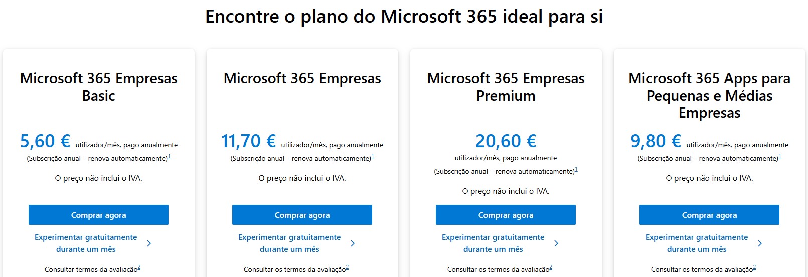 Acede ao site oficial: https://www.microsoft.com/pt-pt/microsoft-365/business e selecciona o plano mais adequado às tuas necessidades (podes começar com um trial gratuito por 1 mês).